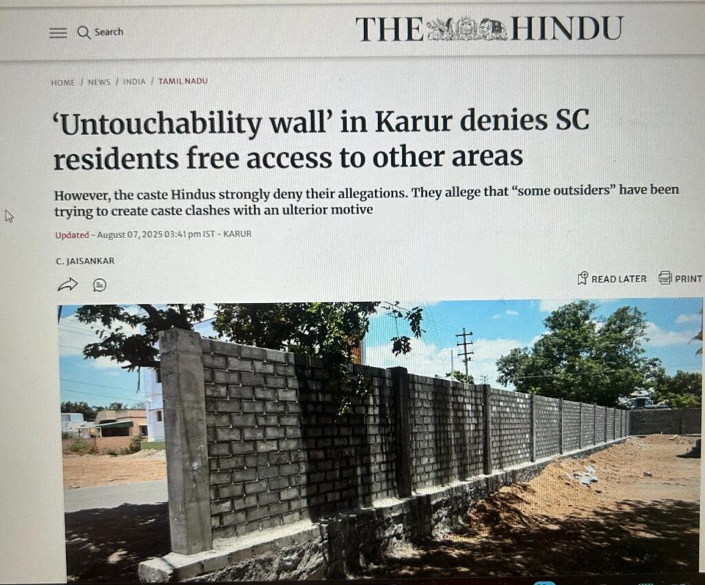 करूर, तामिलनाडु। एक गांव में मनुवादियों ने 200 फीट लंबी और 10 फीट ऊंची दीवार बनाई है। आरोप है कि यह दीवार इसलिए बनाई गई है ताकि गांव के दलितों को थोट्टिया नायकर के इलाकों में जाने से रोका जा सके। दलित समाज के लोग इस दीवार को छुआछूत की दीवार कह रहे हैं। मामला तमिलनाडु के करूर जिले का है। जिले के मुथुलादमपट्टी गांव में बनी इस दीवार से मामला गरमा गया है।