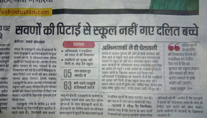घटना बागेश्वर जिले के राजकीय इंटर कालेज तिलसारी में पढ़ रहे अनुसूचित जाति बाहुल्य गांव उड़खली के बच्चों के साथ घटित हुई है. जातिवादियों की पिटाई से पांच से अधिक छात्र घायल हुए हैं. छात्रों में दहशत और भय बना हुआ है तथा जान का खतरा बना है जिस कारण उपरोक्त विद्यालय में 40 से उपर अध्ययनरत छात्रों ने स्कूल जाना बंद कर दिया है. हैरानी की बात है कि पटवारी ने 24 घंटे बीतने के बाद भी खबर लिखे जाने तक एफआइआर दर्ज नहीं की थी. पीड़ित पक्ष के अभिभावकों ने आन्दोलन की चेतावदी दी है. ऐसी घटनाएं लगातार देश में बढ़ती जा रही हैं न सड़क पर दलित सुरक्षित हैं न ही स्कूलों में. लगता है देश को डिजिटल नहीं दलित इंडिया में तब्दील कर दमन की नीति हो रही है. क्या न्यू इंडिया की शुरुआत मॉब लिचिंग से हो रही है जिसमें दलितों को, अल्पसंख्यकों को निशाना बनाया जा रहा है. स्कूल में ही जब बालिकाएं सुरक्षित नहीं तो बेटी बचाओ – बेटी पढ़ाओ का नारा मात्र दिखावा और चुनावी जुमला ही बन कर रह गया है.
