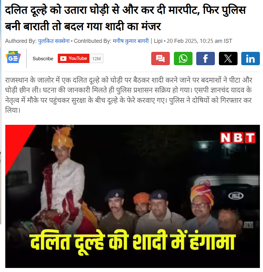 सवाल है कि भारत की सरकार देश को तो साल 2047 के विकसित और शानदार भारत का सपना दिखा रही है, लेकिन क्या वह देश की आजादी के 100 साल बाद 2047 में जातिवादी भारत को भी देखना चाहेगी, अगर नहीं तो देश की 25 फीसदी से अधिक आबादी को जिस जातिवाद के सवाल से हर रोज जूझना पड़ता है, उस सवाल के हल पर बात क्यों नहीं करना चाहती। क्योंकि अगर जातिवाद पर गंभीर चर्चा शुरू नहीं हुई तो देश भले ही 2047 में आजादी के 100 साल का जश्न मना रहा होगा, देश के दलितों और आदिवासियों की एक बड़ी आबादी को अगर जातिवादी घटनाओं से छुटकारा नहीं मिलता, समानता नहीं मिलती तो उनके लिए यह जश्न अधूरा ही रहेगा। सवाल यह भी है कि आखिर एक वर्ग को इंसान से ज्यादा घोड़ी क्यों प्यारी है?