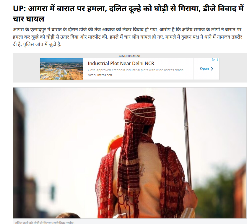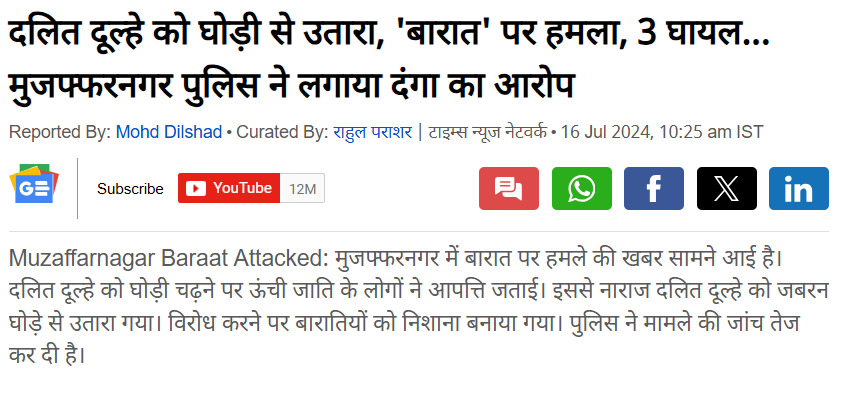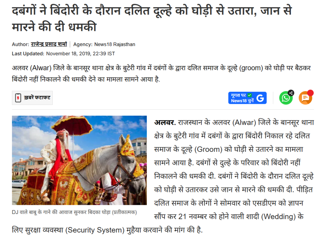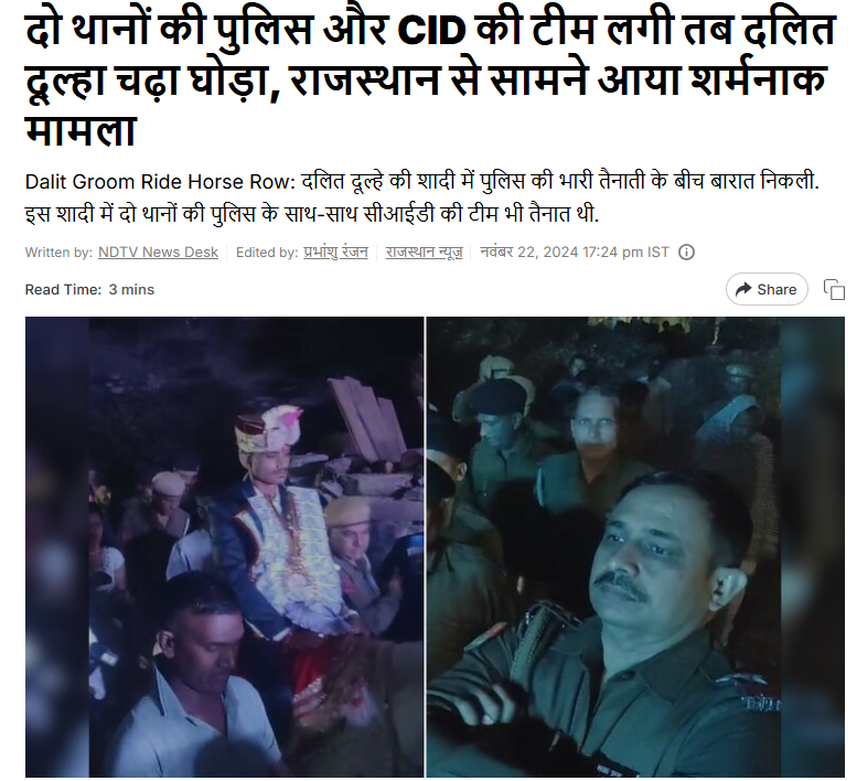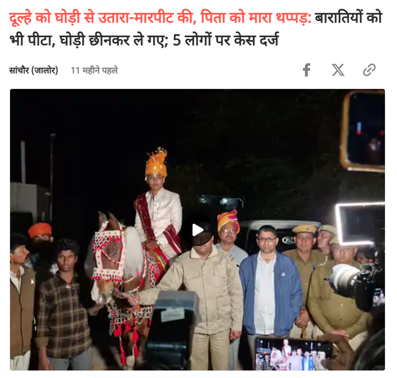आप खबर के नीचे आखिर में मीडिया में प्रकाशित उन खबरों में देख सकते हैं कि यह कोई अकेली घटनाएं नहीं है, बल्कि यह कथित अगड़ी जातियों के बीच बड़ी बीमारी बनती जा रही है। यह बीमारी गुजरात और राजस्थान के बाद हरियाणा और उत्तर प्रदेश में भी पहुंच गई है। वहां से भी ऐसी कई खबरें सामने आ चुकी है।
