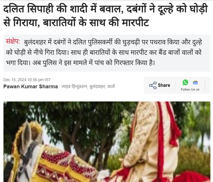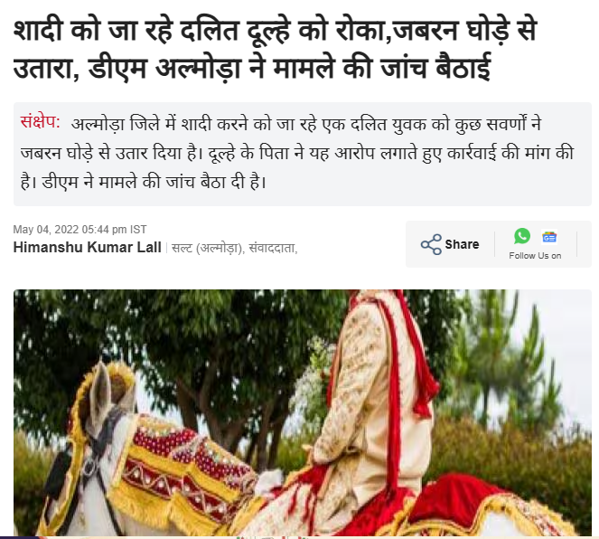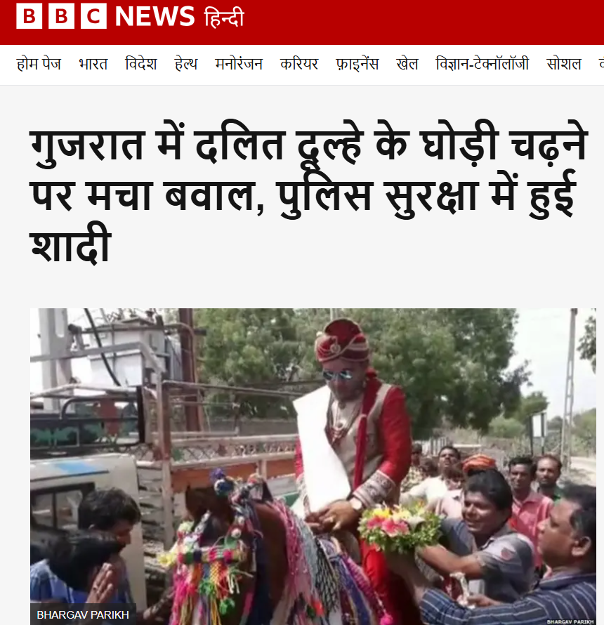 तो वहीं 2020 में बनासकांठा में सेना के जवान की बारात पर सिर्फ इसलिए पथराव किया गया क्योंकि वह घोड़ी पर बैठा था। इसी तरह 18 जून 2018 को बीबीसी में प्रकाशित खबर के मुताबिक गुजरात के माणसा तहसील के पारसा गांव में बारात लेकर पहुंचे दलित युवक को जातिवादी गुंडों ने घोड़ी से नीचे उतार दिया।