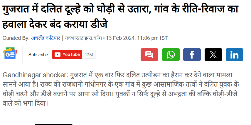 फरवरी 2024 में गांधीनगर में चड़ासना गांव में दलित दूल्हे विकास चावड़ा के साथ घोड़ी से खींचकर मारपीट की गई थी।