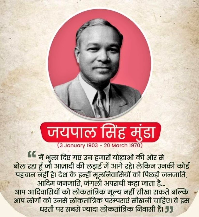 जयपाल सिंह मुंडा जी की जयंती पर उस दूरदर्शी आदिवासी नेता को नमन, जिन्होंने आदिवासी अस्मिता, अधिकार और स्वशासन की आवाज़ को राष्ट्रीय मंच तक पहुँचाया। वे केवल एक महान खिलाड़ी नहीं, बल्कि संविधान सभा में आदिवासियों की गरिमा और हक़ के सबसे मुखर प्रहरी थे।
